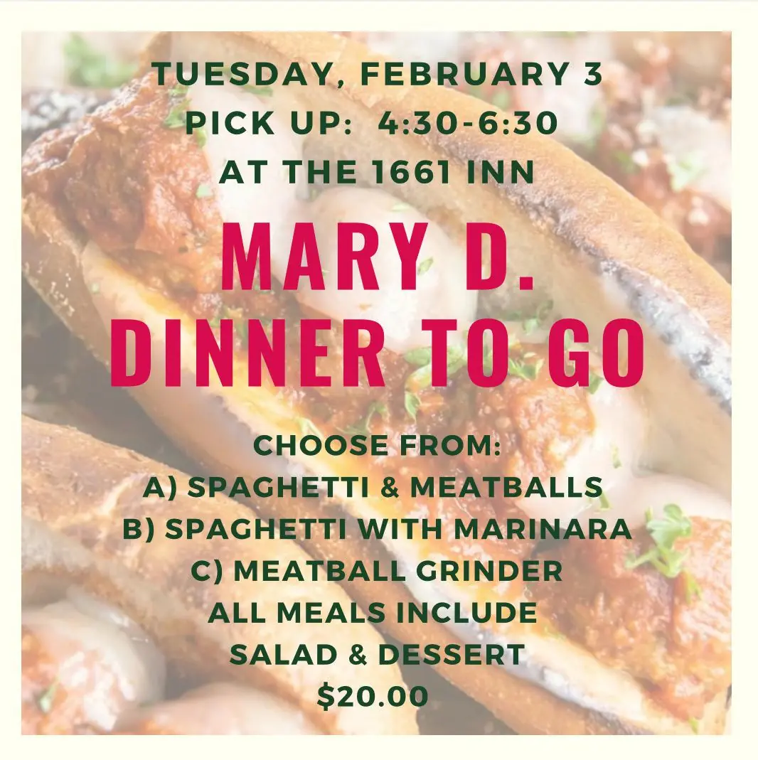 The Annual Mary D Fund Dinner-to-Go is on Tuesday Feb 3. Please help us raise money for the Mary D Fund and enjoy a yummy homemade dinner! To order please email Charlotte at cherring@tnc.org or call/text at 401-932-2941 with your dinner selections.