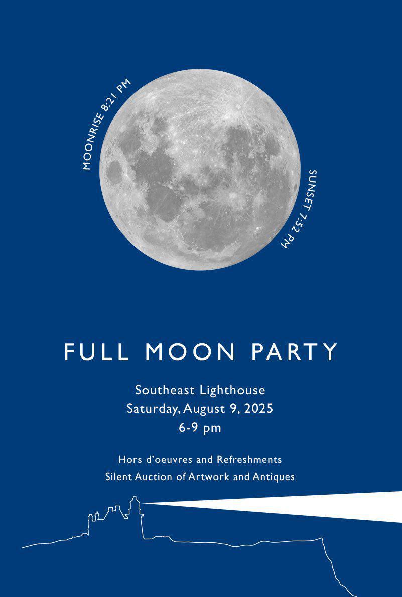 Enjoy the beauty and drama of a rising full moon from the grounds of Southeast Lighthouse at 8:21 pm. You can savor special Hors d’oeuvres and Refreshments in the glow of the full moon.