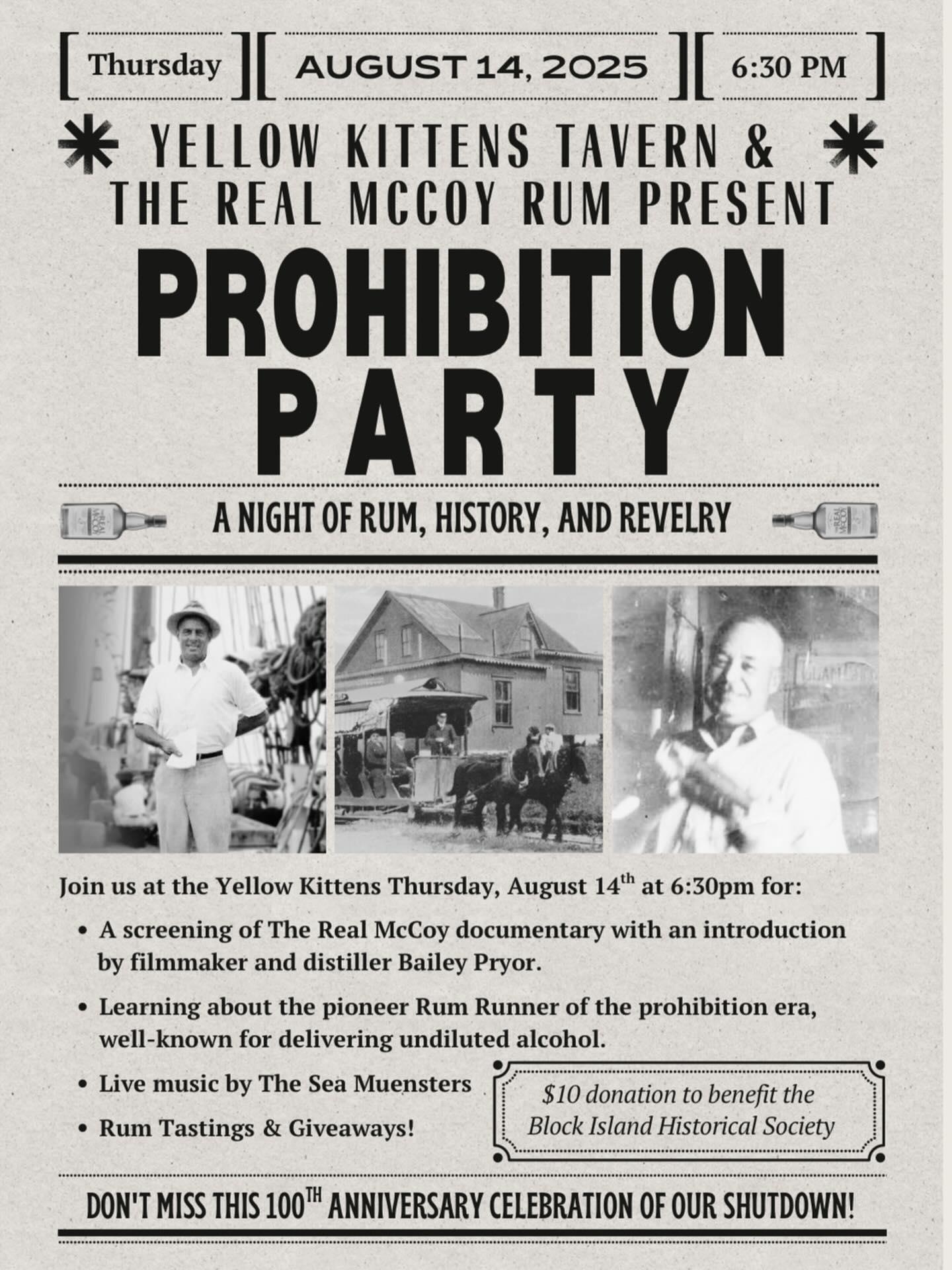 Prohibition Party at Yellow Kittens Thursday, August 14 at 6:30pm for: