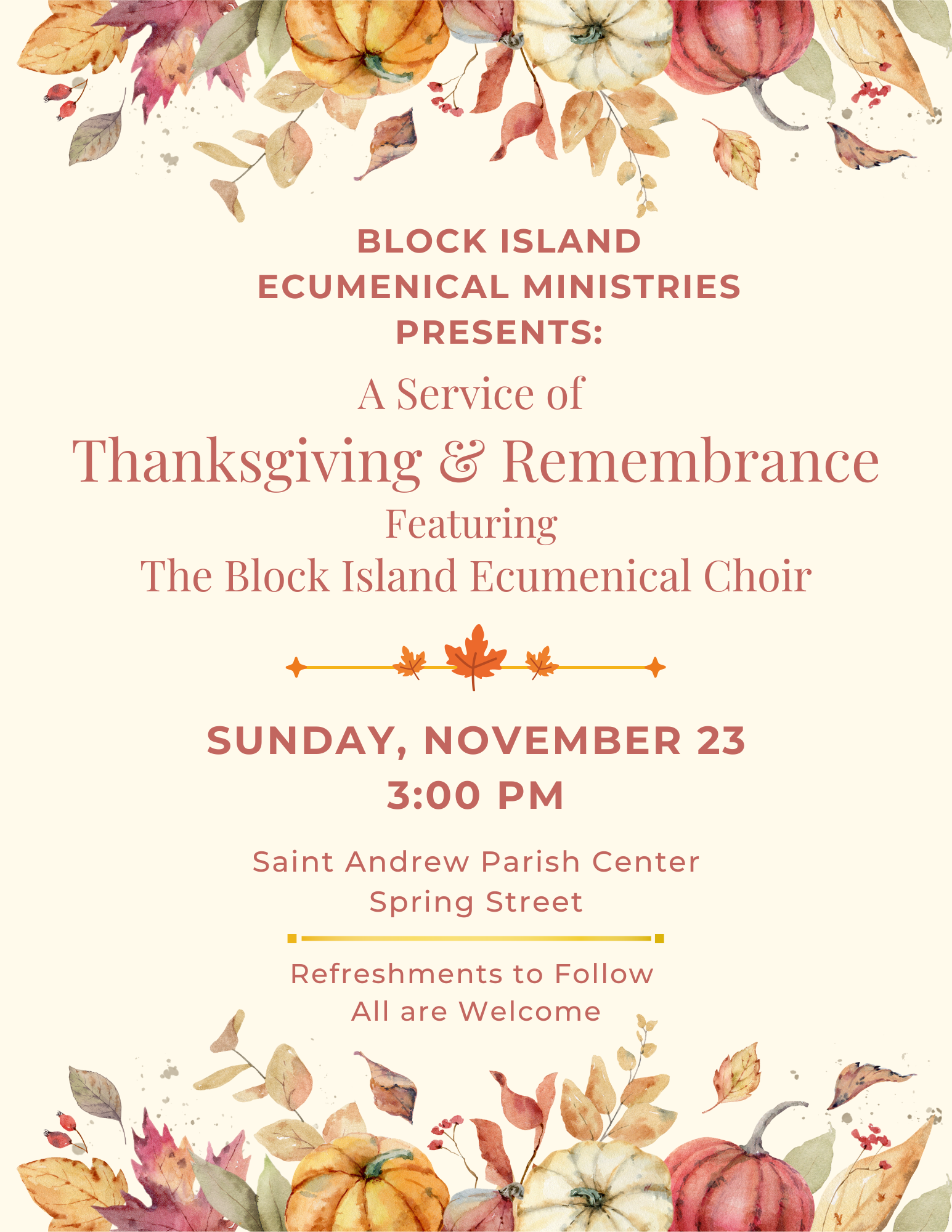 Block Island Ecumenical Ministries Presents: Service of Thanksgiving & Remembrance Featuring The Block Island Ecumenical Choir. Refreshments to Follow. All are Welcome.
