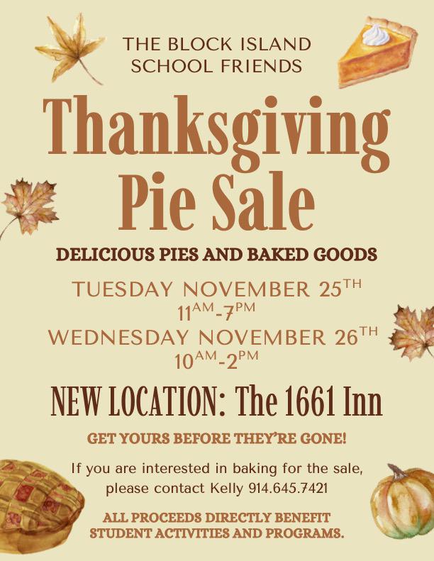The Block Island School Friends are excited to announce our Annual Thanksgiving Pie Sale—our biggest fundraiser of the year! This year’s sale will take place at our new location, The 1661 Inn. We’ll have a delicious assortment of homemade pies and baked goods, and as always, all proceeds directly benefit student activities and programs at the Block Island School. Get your favorites early—these pies go fast!
