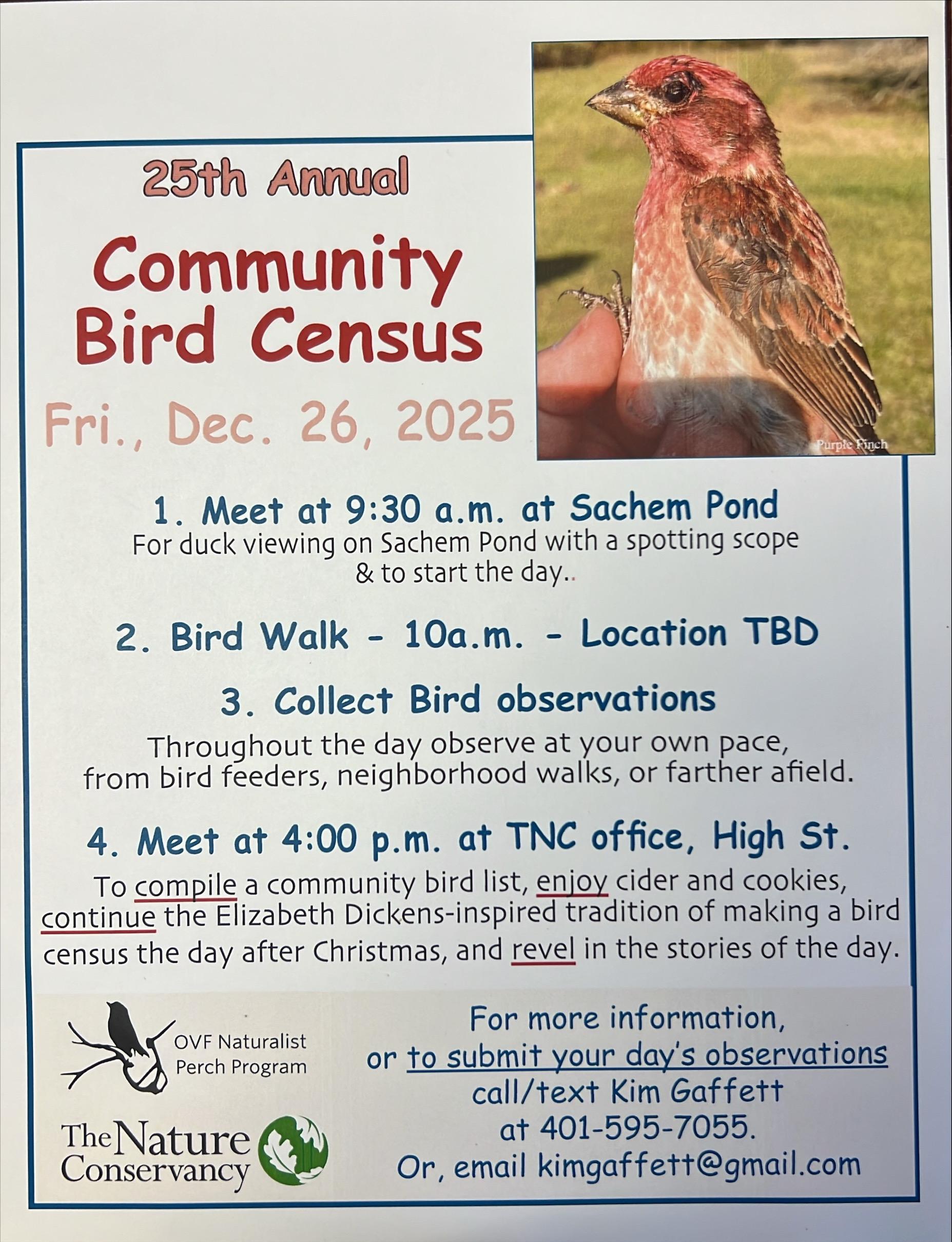 To compile a community bird list, enjoy cider and cookies, continue the Elizabeth Dickens-inspired tradition of making a bird census the day after Christmas, and revel in the stories of the