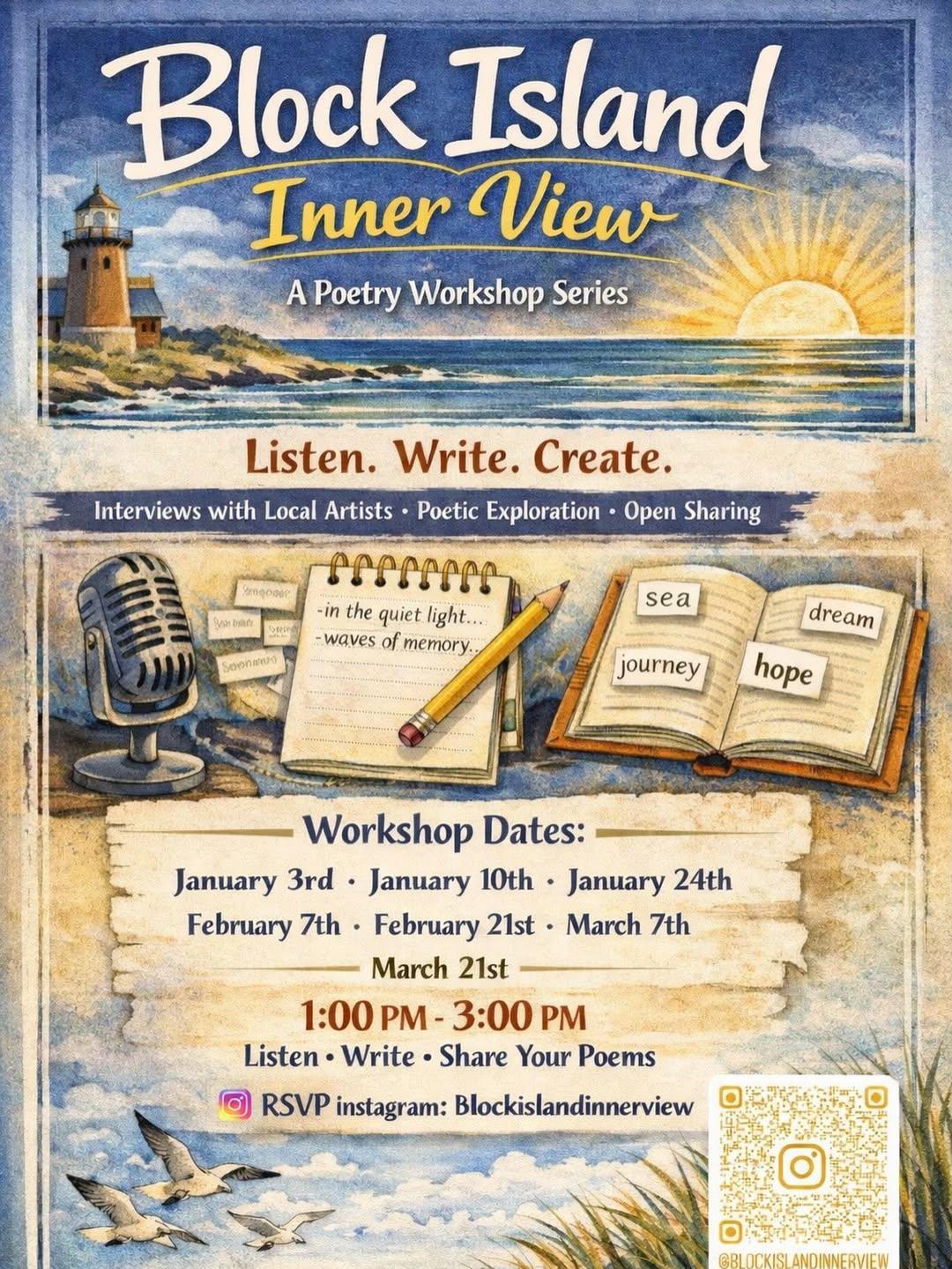An innovative and inspiring poetry workshop with Josiah Messer. Find out more and register on Instagram at Block Island Inner Views.