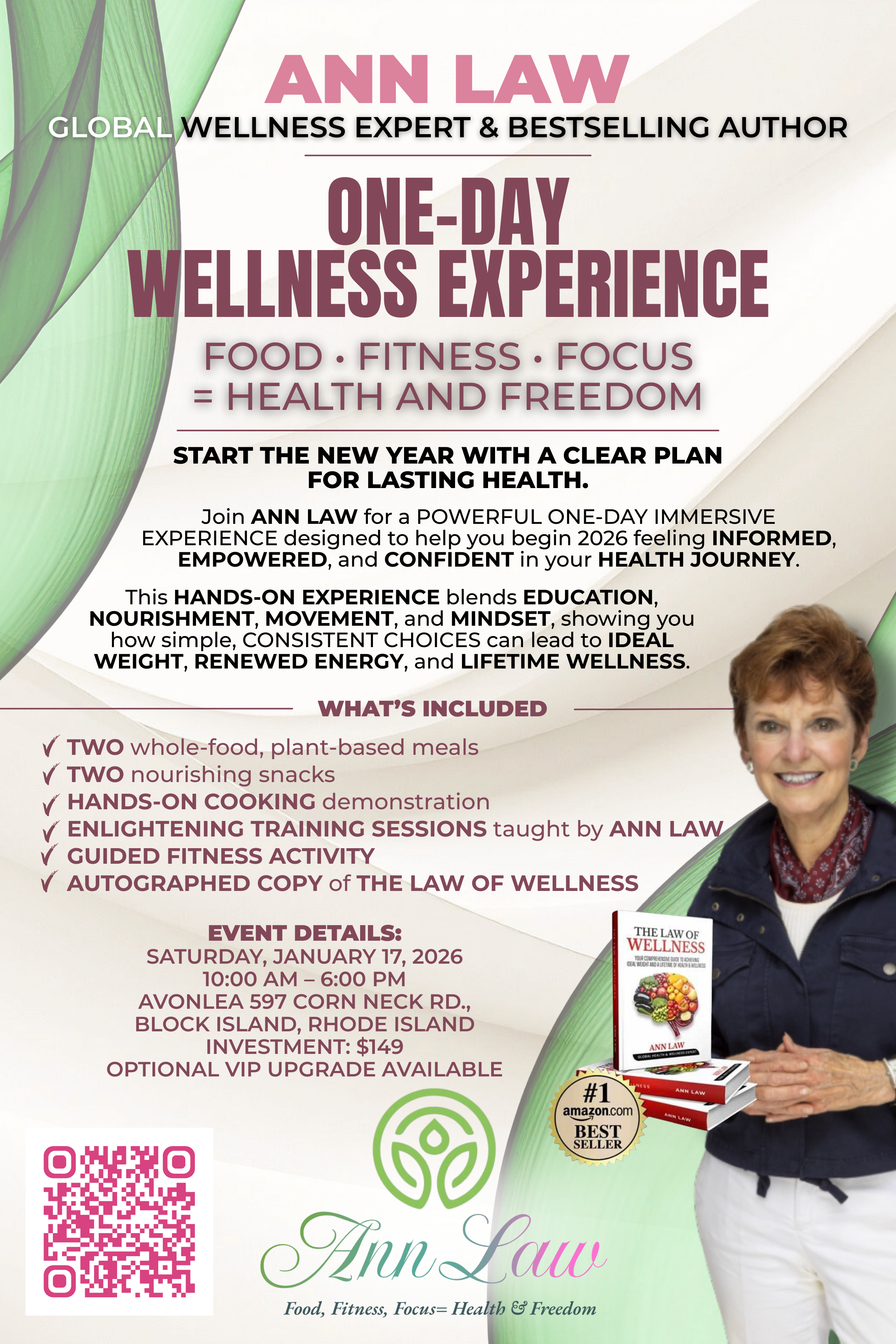 Join Ann Law, Global Wellness Expert and Bestselling Author, for a powerful one-day immersive experience focused on FOOD • FITNESS • FOCUS = HEALTH & FREEDOM