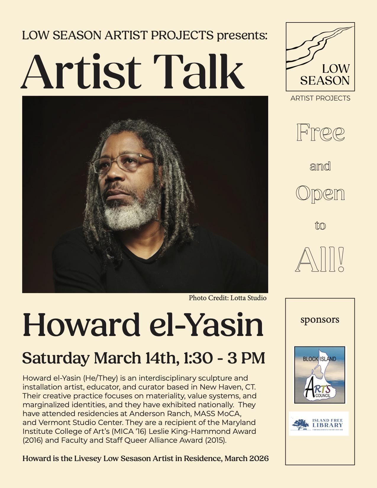 Low Season Artist Projects is an artist-run residency program partnering with the Block Island Arts Council and the Old Town Inn. The residency promotes community interaction through lectures and workshops for island residents. It provides time and space for visiting artists to engage with the history, landscape and ecology of Block Island during the low season.